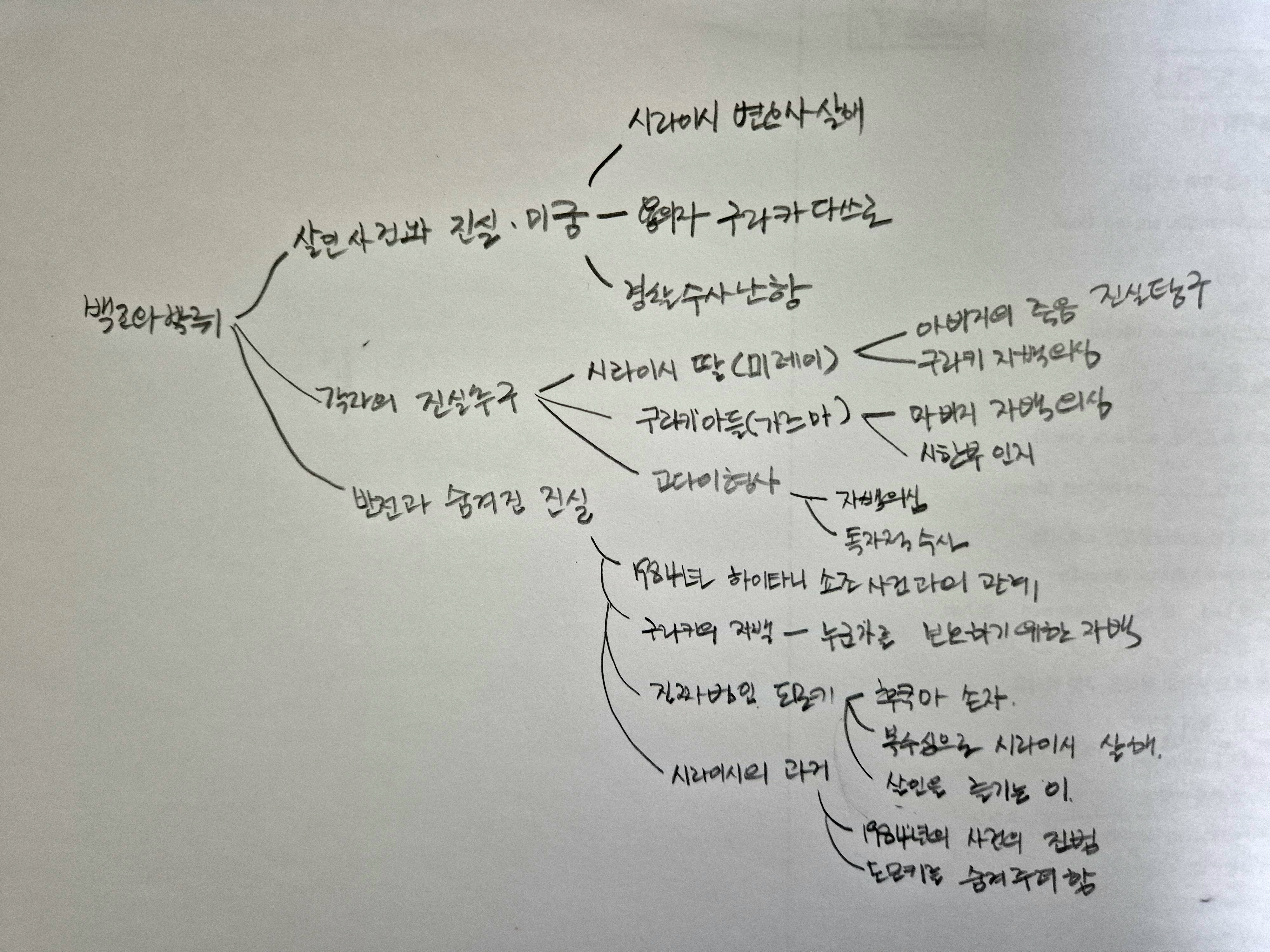 조사가 진행되며 1984년에 발생한 하이타니 쇼조 살인 사건과 이번 사건이 엮여 있음이 드러납니다. 표면적으로 드러난 자백은 사실 위장이었고, 구라키는 누구를 보호하기 위해 자신이 죄를 뒤집어쓴 것이었습니다. 모든 사건의 실마리는 거짓 자백과 억울한 누명이었습니다. 읽는 내내 구라키가 왜 누구를 감춰주기 위해서 거짓 자백을 하는지가 궁금했습니다. 용의 선상의 인물들을 의심했지만 갑자기 다른 인물이 나타나서 읽으면서 깜짝 놀랐습니다.