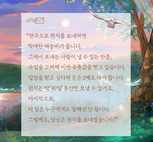 이 소설의 세계관에는 '아오조라 우체국'이라는 특별한 우체국이 존재합니다. 이 우체국에서는 세상을 떠난 사람이 천국으로 가기 전 49일 동안 편지를 주고받을 수 있습니다. 아오조라 우체국을 통해 죽은 사람과 소통할 수 있다는 사실은 외부에 발설해서는 안 되는 조건이 있습니다. 값비싼 우표와 편지를 보내는 사람들 주인공들은 천국으로 편지를 보낼 수 있다는 아오조라 우체국의 존재를 알게 되며, 처음에는 망설이지만 결국 전 재산을 걸고 값비싼 우표를 구매하여 편지를 보냅니다. 우표 가격은 이용자의 소득 수준에 따라 다르게 책정되는데, 가난한 학생에게는 약 30만 원, 기업 경영자에게는 억 대에 달하기도 합니다. 저는 이 부분에서 '나라면 어떻게 할까'라는 생각을 했던 것 같습니다. 우표값이 너무 비싸니까요.