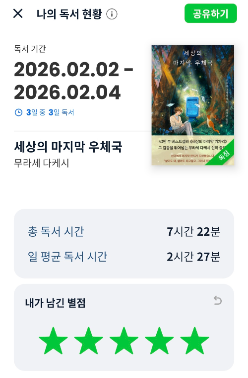 자극적인 전개 대신 조용한 위로와 잔잔한 감동을 원한다면, 이 작품은 충분히 만족스러운 선택이 될 것이라 생각합니다. 힐링 소설을 찾고 있는 독자라면 편안한 마음으로 읽어보기를 추천합니다. 책탐리뷰였습니다. 감사합니다.