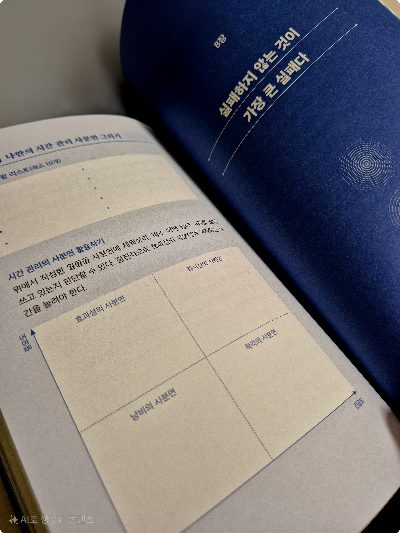 시간은 누구에게나 공평합니다. 하지만 이를 어떻게 쓰느냐에 따라 인생의 질은 달라집니다. 저자는 사분면으로 나누어서 시간관리를 하고 있다고 합니다. 사실 이 부분은 평범한 직장인이라 별로 와닿지는 않았지만 그만큼 시간관리의 중요성과 일의 우선순위에 대해서 알게 되었고, 사업을 하시는 분이라면 사분면의 시간 관리법이 유용하게 적용될 것이라 생각됩니다. 저도 업무와 일상에서 우선순위를 다시 점검해 보았습니다.