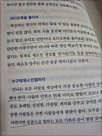 7가지 습관 중에 몇 가지만 소개해보자면, 첫 째, SNS나 쇼츠 콘텐츠를 소비하지 말고 책을 가까이하라, 둘째, 인생의 목표를 하루도 빠짐없이 노트에 적어라, 어제 적은 것을 보지 말고 매일 새로이 적어라, 셋째, 언제든 들을 수 있는 오디오 강연이나 오디오북을 들어서 새로운 정보를 받아들이는 것을 멈추지 마라. 이 세 가지는 저의 마음에 와닿았던 문장으로 밑줄을 그어 놓았습니다.